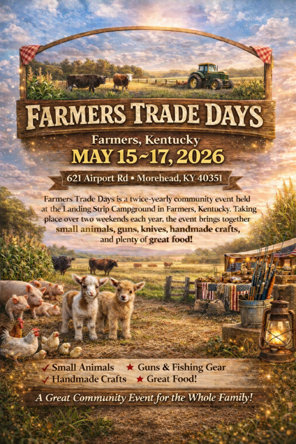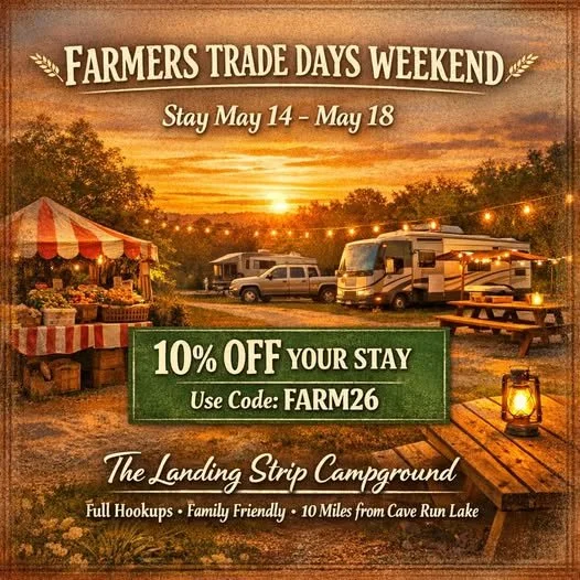 Join us for a weekend full of local flavor, handmade goods, great food, and family fun at Farmers Trade Days. Hosted at The Landing Strip Campground in Morehead, Kentucky. Held each spring and fall, this lively festival-style marketplace brings together farmers - artisans - craftsmen - food vendors and small businesses from the region.